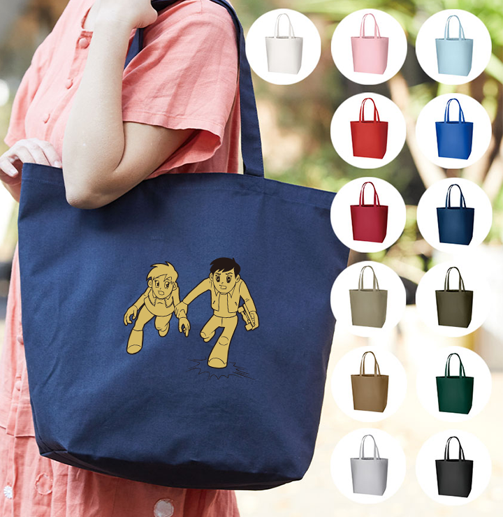全4色 広めの底マチが使いやすく、生地も厚手なのでバッグ単体で自立もします。同仕様でMサイズ、Lサイズもございますので、お好みのサイズからお選びください。 DTFプリント